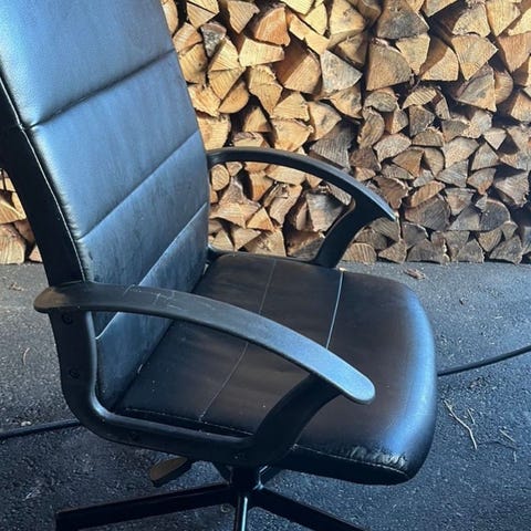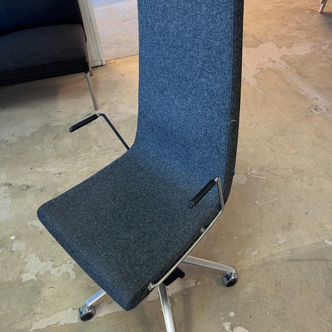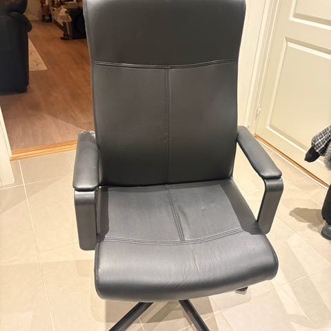 Svart kontorstol i kunstlær med høy rygg og armlener. Justerbar høyde og hjul for enkel bevegelse. Passer for bruk ved skrivebord.