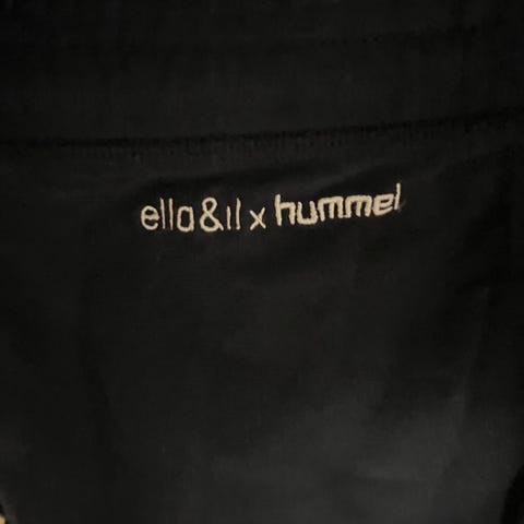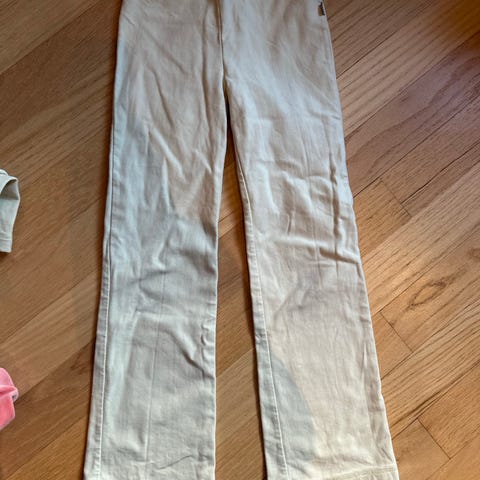 Gul og blå bukser har noen svake bruksmerker et par steder hvis man studerer i lys.