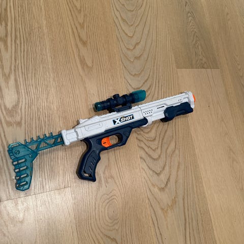 Motorisert sprengning: Denne Adventure Force V-Twin-blasteren har batteridrevet, helautomatisk hurtigild med et roterende Gatling-løp.