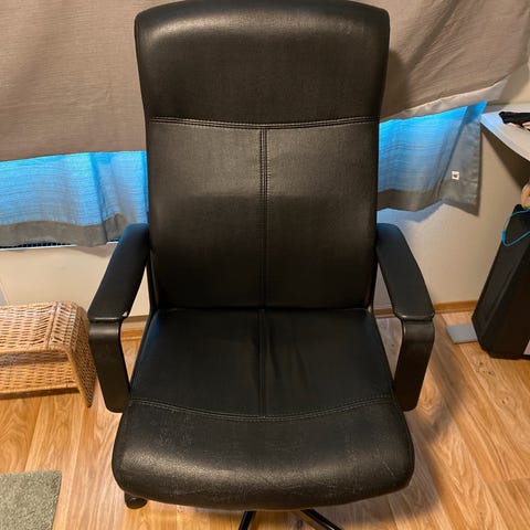 Svært behagelig kontorstol selges da vi ikke har behov for den lenger. Den er godt brukt med en del slitasjemerker, men er svært god å sitte i. Gasspatronen bør også byttes, da stolen synker over tid.
