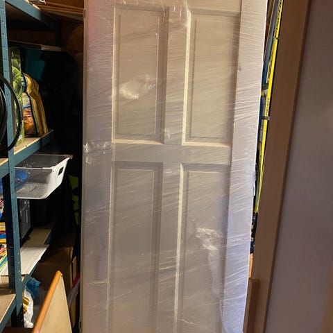 Hvit innerdør med standard dørhåndtak, 83x104 cm dørblad. Døren er enkel i design og egnet for innendørs bruk.