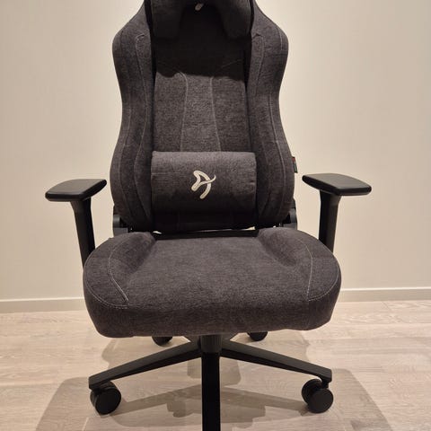 Arozzi vernazza, følger med armlene puter for ekstra komfort. Ca 4 år gammel stol, nyere armlene puter. Meget god stol i stoff, fungerer fint selv om sommeren, blir ikke klam. Justerbare høyde og rygg. Begge armlene er også justerbare. Har 5 hjul. Prisvinner tek.no