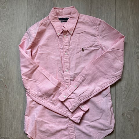 Ralph Lauren skjorte i størrelse L for kvinner. Skjorten er laget av bomull og har en rosa farge. Den har et klassisk design med knapper og brodert logo på brystet. Obs - mangler ein knapp.