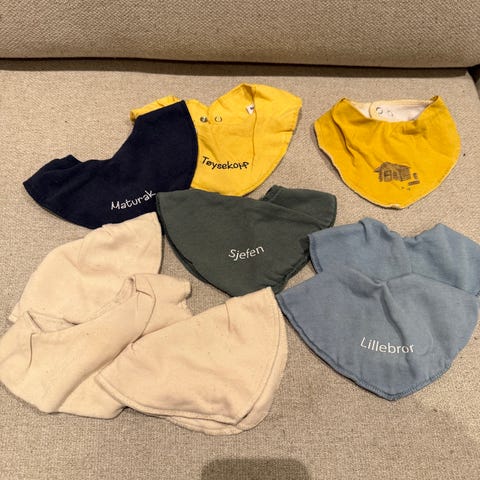 Selger smekkene for 30,- stykke, sløyfer for 20,- pr stykk og luene 20,- pr stykk.