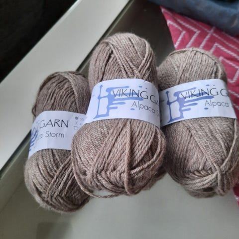 Rester etter Mari Sweater, 1 nøste( 50g) farge kamel (57), 40 g av himmelblå ( 99) og et helt nøste og et med ca 40 g av fargen Patina grønn( 40)