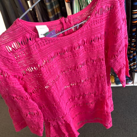 Grå bluse med lommer og trekvart ermer. Størrelse 2XL. Materiale: 65 % polyester, 35 % rayon.