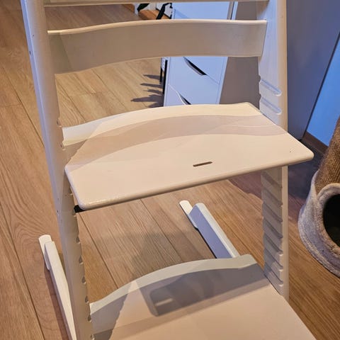 Eldre modell Stokke tripp trapp stol, godt brukt. Justerbar sitte- og fotplate for tilpasning etter barnets størrelse. Inkluderer bøyle.