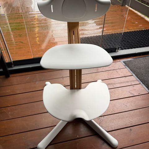Stokke høy barnestol med hvitt trinn for fotstøtte og sete . Designet for barn, laget i slitesterkt materiale som gir god støtte og komfort.
