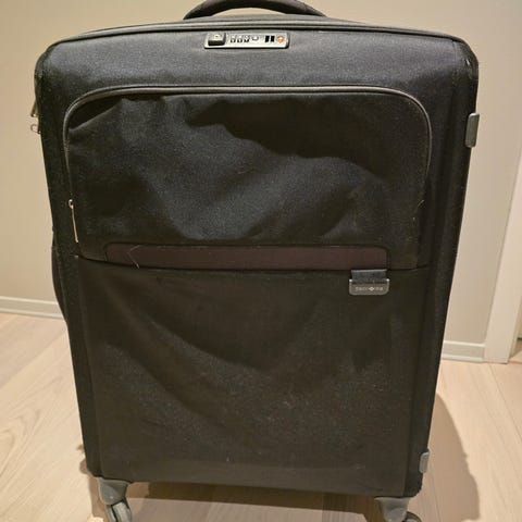 Koffert i hardplast. Kofferten har et solid ytre med en strukturert overflate, håndtak og fire hjul for enkel transport. Innvendig er den romslig med stropper for å sikre innholdet. Utvidelsesmulighet og fast TSA-lås. Kun brukt en gang i forbindelse med flytting fra utland.