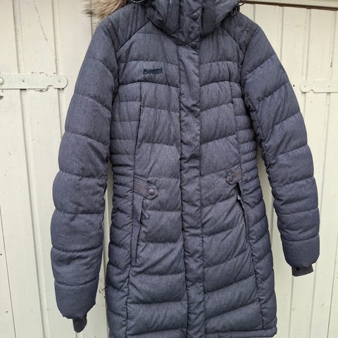 Bergans varm kåpe i dun. Bruker normalt str. M, men denne passer i S. Produktet er sertifisert etter Responsible Down Standard (RDS). Liten reparasjon på innsiden i sømmen, men ingen lekkasje av dun. Se bilde. Kan sende eller kan hentes