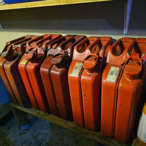 To bensinkanner i metall, en rød og en grå. Selges samlet 500,-