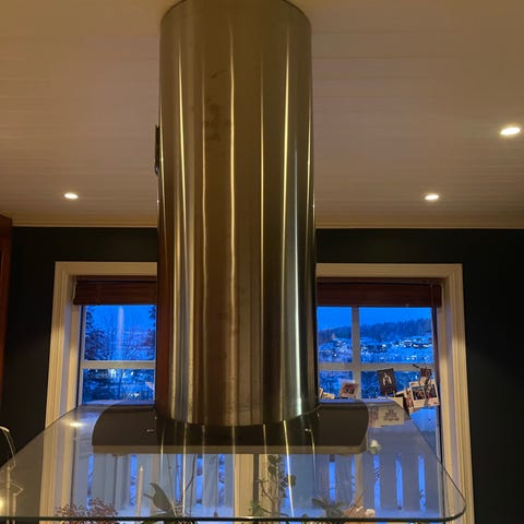 Kjøkkenventilator i rustfritt stål, sylinderformet design. Egnet for montering over kjøkkenøy eller benk. Stilrent og funksjonelt ventilasjonselement.