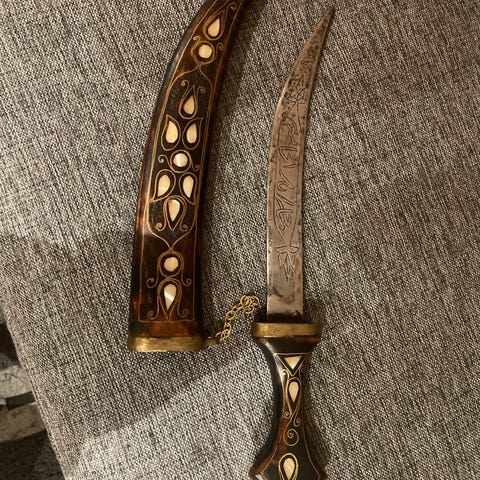 Klassisk utforming med parerbøyle og detaljer i messing/bronse-look, wireviklet grep og dekorert klinge.