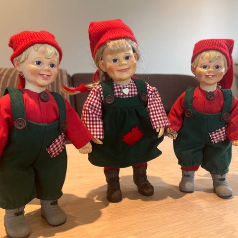 Jul dekorasjonsnisser i tradisjonell design med røde luer, rutete skjorter, og klær i grønt og svart ullstoff. Passer som juledekorasjon.