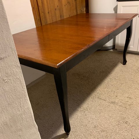Bordet er kjøpt hos en antikvitetshandler og pusset opp hos en møbelsnekker, har en ileggsplate lik bordet og 4 trehvite. Diameter 120 cm og total lengde 420 cm med alle plater.