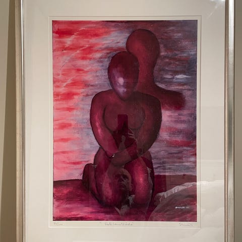 Grafisk trykk, nummerert 50 eksemplarer, signert og datert 1997. Abstrakt kunstverk med geometriske former og linjer i grå og røde toner.