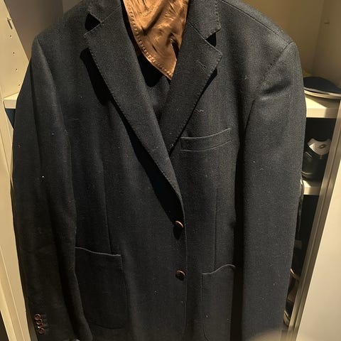 Strøken og ubrukt blazer fra Oscar Jacobson i fargen Navy 210 og ullkvalitet 8515. Joel er en romslig blazer for rørslige karer, med mer plass i skuldre og midje, samt god lengde. Selv ble den ikke helt optimal for min fysikk. Buksen satt bra, så kun blazeren selges. Opplever det som en blazer med god lengde og med dype slag, litt kort i ermene om du er ganske lang (feks over 190 cm) og ellers god og romslig passform i merkets anerkjente kvalitet. Over skuldrene sitter den som en XXL (som jeg er i vanlige klær). Nypris 5000,-