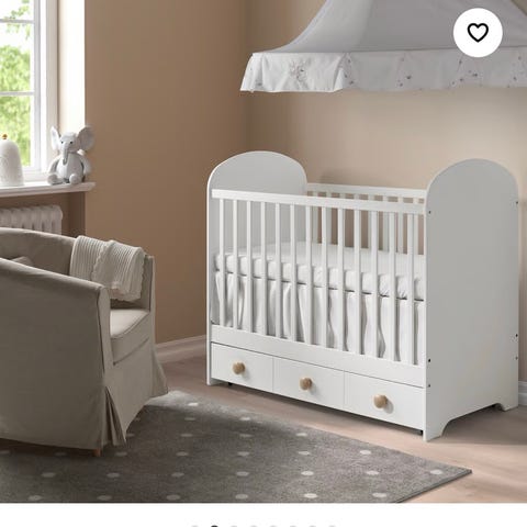 IKEA Sprinkelseng barneseng med hvit farge. Laget ekstra høyde for å tilpasses voksen seng. Lite brukt. Må hentes, demontert