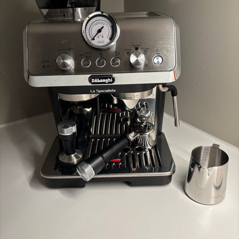 DeLonghi La Specialista er en halvmanuell espressomaskin i rustfritt stål. Maskinen har muligheter for de fleste espressobaserte drikker. Velg mellom å steame manuelt eller la maskinen gjøre jobben for deg automatisk(fungerer svært bra - vi har endt med å bruke denne funksjon fremfor steamrøret).