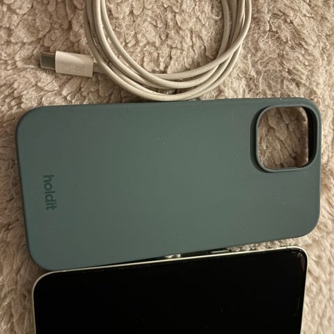 Apple iPhone 12 med 128 GB lagringskapasitet. Telefonen har en hvit farge og er utstyrt med to kameraer på baksiden. Batterikapasiteten er målt til 79 % av maksimal kapasitet, noe som kan påvirke batteriets levetid mellom ladinger.
