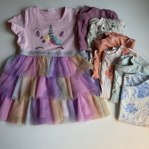 7 gensere, 2 Elsa kjoler, 4 tyll skjørt, en cardigan, kjole, fra div merker mye H&M i størrelse 98/104, flerfarget, til jenter. Pent brukt, ingen flekker.