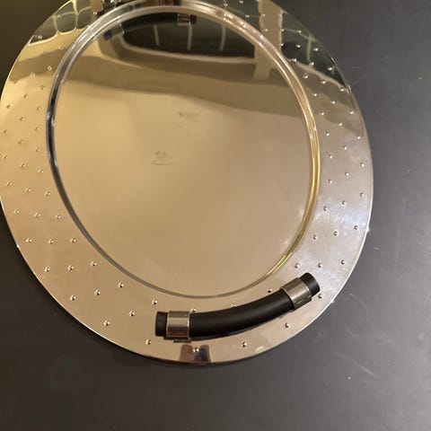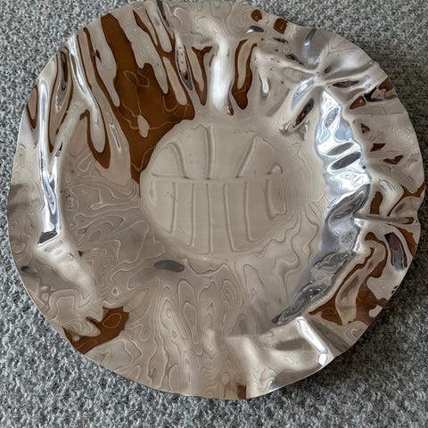 Alessi "Les Ministres" serveringsfat, designat av Philippe Starck selges. Fatet er rundt med en reflekterende overflate i metall og en mørk grå base formet som en figur som støtter fatet. Fatet kan brukes som dekorasjon eller til å holde små gjenstander. Det er noen riper på overflaten, muligens disse kan poleres vekk - jeg har ikke prøvd. Hentes i Ski, kan også sende. Se også mine andre annonser.