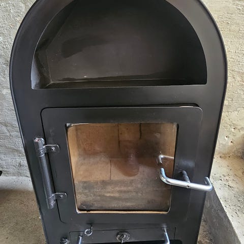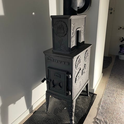 Dovre vedovn i støpejern med dekorative detaljer. Egnet for oppvarming av rom ved bruk av ved som brensel.Lengde 70 cm, høyde 72 cm, bredde 33 cm. Ildfaste steiner montert innvendig. Selges med røkrør for montering i hjørne. Kr 2000,-