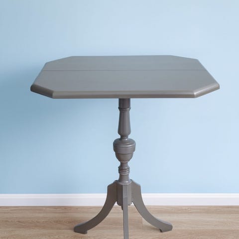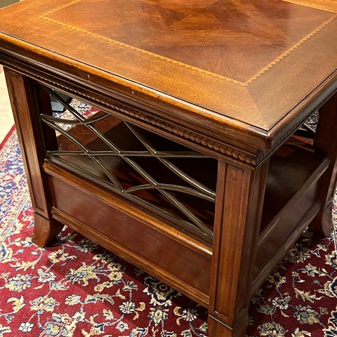 Sidebord med klassiske detaljer. Bordet har en flott dekorert bordplate med innlagt tremønster (intarsia) og en elegant dreid fot med tre buede ben.