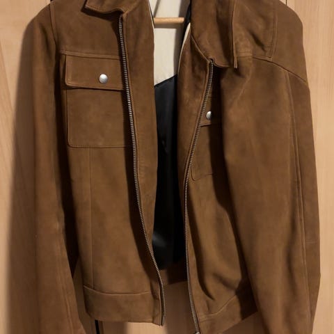Selger en flott jakke i semsket skinn, kjøpt i Spania for noen år siden. Jakken er i god stand, med unntak av at stroppen/hengeren på innsiden (den som brukes til å henge opp jakken) er røket.