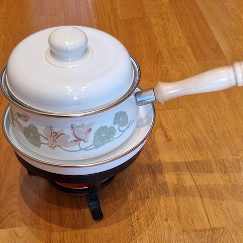 Emaljert kjele med lokk og håndtak, inkludert en brenner med justerbar flamme.
