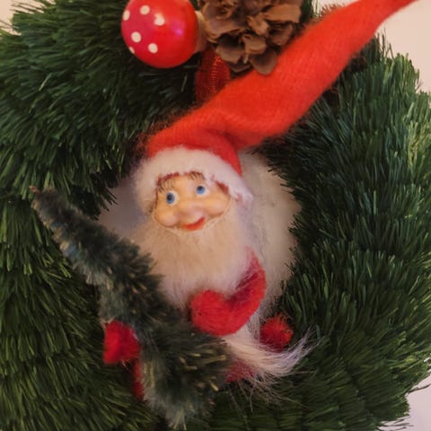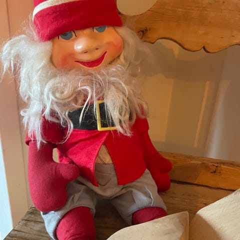 Veldig koselig gammel julepynt laget av piperensere. Her sitter nissen og ekorn på en trestamme. Nissen holder I en kongle. Skjelden å se denne.