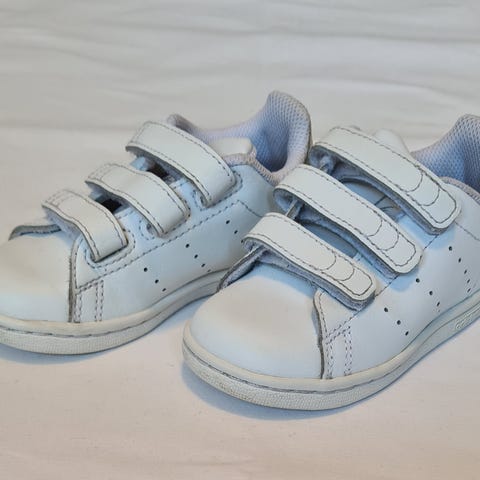 Adidas Stan Smith barnesko størrelse 25 i hvit farge, designet for unisex bruk. Skoene har borrelås og er laget i materiale som gir komfort og støtte til barnets føtter.