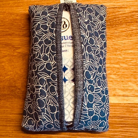 Hjemmesydd etui til oppbevaring av lommetørklær. Sydd i bomull. Har flere for salg, se mine andre annonser også. Praktiske å ha liggende i vesker, bagger, i bilen, på jobb osv. Prisen er pr stk. Fine gaver som kommer til glede og nytte. Har kun igjen 1 av denne kombinasjonen