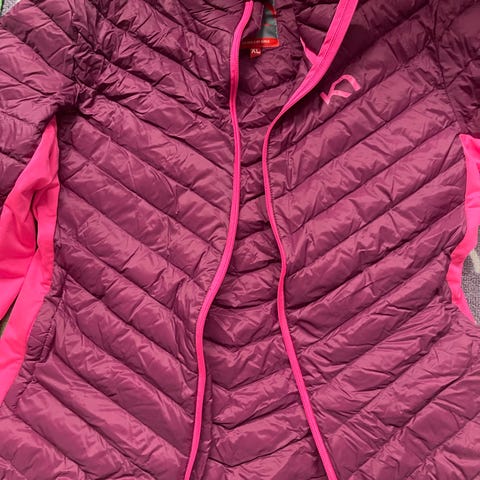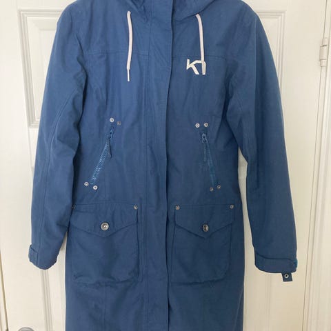 Kari Traa jakke i størrelse XL, farge blå. Jakken har hette, snøring og belte i midjen for justering.