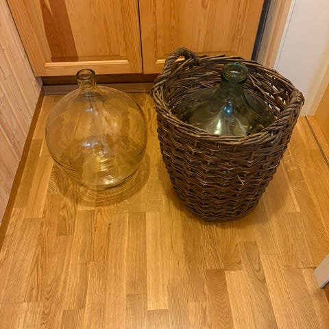 Jeg lager ikke vin lenger og selger derfor mine to glassballonger - enten sammen eller hver for seg. Litt vinutstyr kan fåes med på kjøpet. Ballongen i kurv vil jeg ha 300 kroner for - den andre 200 kroner. Ballongene bør kunne hentes.