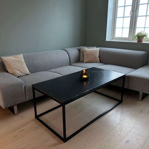 Kombinasjonen av herdet glass og massiv marmor gir både et luftig og luksuriøst preg. Pent brukt og i god stand, uten skader.