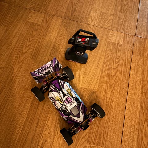 Top Racing radiostyrt bil med fjernkontroll og batteri. Bilen har firehjulstrekk, støtdempere og robust dekkdesign for terrengkjøring. Fjernkontrollen har rattstyring og flere kontrollfunksjoner. Batteripakken er inkludert.