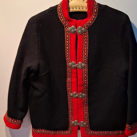 Nydelig jakke i 100 % ull med vakre broderte detaljer og dekorative knapper. Jakken er i perfekt stand, helt uten skader eller slitasje, og fremstår som ny.