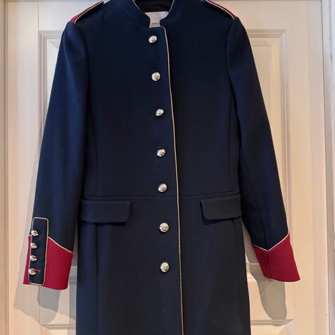 Den stilige kombinasjonen av mørk ull, røde kanter og perlebroderi gir et elegant, uniform-inspirert uttrykk. Perfekt både til hverdags og fest for deg som ønsker et unikt plagg i garderoben.