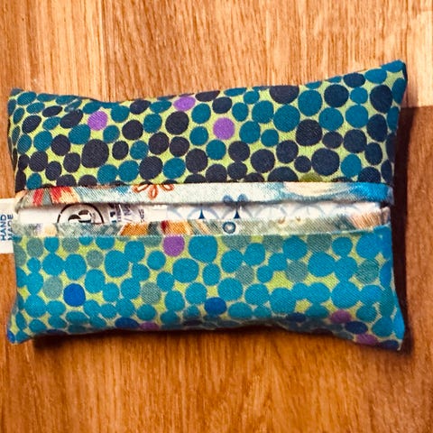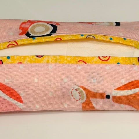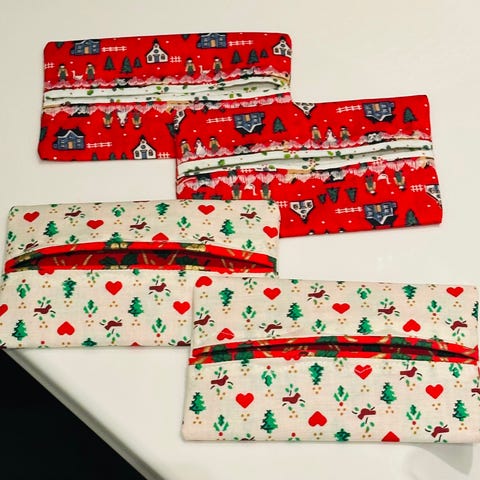 Hjemmesydd etui til oppbevaring av lommetørklær. Sydd i bomull. Har flere for salg, se mine andre annonser også. Ytterstoffet på disse er blomstrete og foret er mørkeblått. Praktiske å ha liggende i vesker, bagger, i bilen, på jobb osv. Prisen er pr stk. Fine gaver som kommer til glede og nytte.