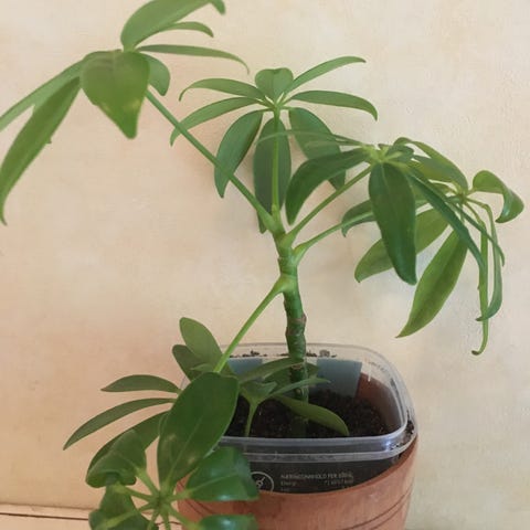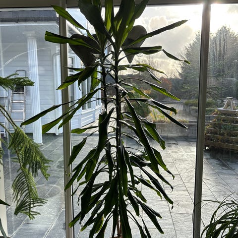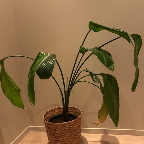 Elefantfot selges, må hentes på stord. Jeg har klippet denne ganske langt ned for litt over ett år siden, derfor noen blader lengre enn andre. Dette vil jevne seg ut. Potteskjuler følger ikke med.
