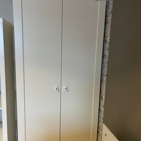 Pen brukt IKEA Platsa barneskap, men grå dører og stang for å henge opp klær. Noen bruksmerker etter bruk av et barn.