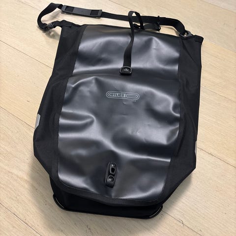 Tern sykkelveske i svart, vanntett materiale. Vesken har rullelukking med spenne og bærehåndtak. Egnet for bruk på sykkel for oppbevaring av personlige eiendeler og utstyr.