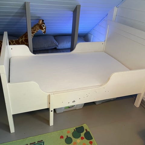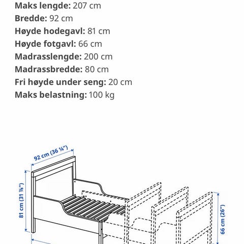 Det følger med madrass pluss madrassdelene som kan legges i når sengen trekkes ut. Kan også gå med en sengehest hvis ønskelig. Sengen har uttrekkbar funksjon som gjør det mulig å justere lengden, passer for barn og gir fleksibel soveplass.