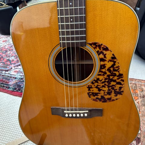Gibson J-35 akustisk gitar med naturfarget trefinish. Modellen er kjent for sin klassiske design og lydkvalitet. Gitaren har tradisjonell form og detaljer i treverk.