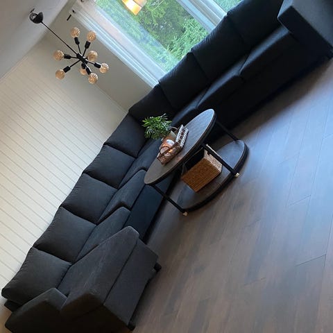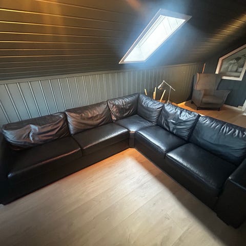 Pent brukt hjørnesofa i rød hud. Hver del er 200 cm lang, så lengste del er totalt 300 cm. Metall bein. Festedings mellom del 1 og 2 mangler. Liten betydning i praksis.