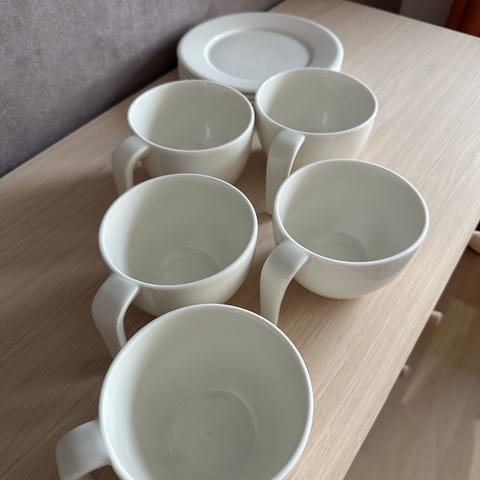Iittala Teema svart keramisk kaffekopp, sett med 6 stk. Selges samlet for 200 kr. Et lite skår i et av krusene (se bilde), de andre fem er strøkne og som nye.