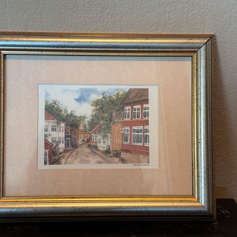 Selger to akvareller av May-britt kjeserud Sett med to signerte malerier i rammer. Det ene maleriet viser et hus med hage, det andre maleriet viser en bukett med blomster. Begge maleriene har detaljerte motiver og er innrammet i gyldne rammer.
