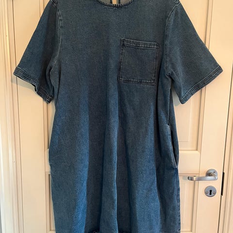 Kaffe denimkjole i blå farge. Kjolen er i størrelse 42 og har knappelukking foran med trykknapper. Jeansstoff med innsving i livet. Pent brukt.