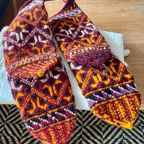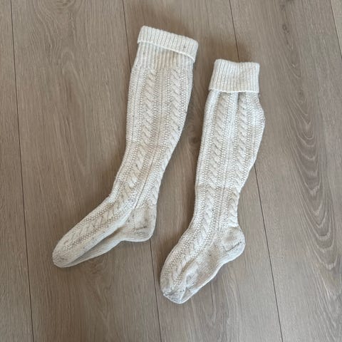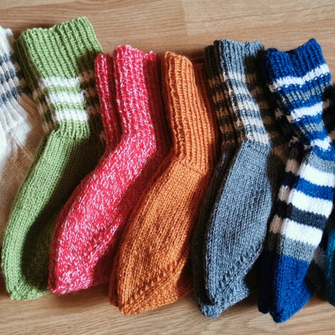 Ulik tykkelse - hjemmestrikka og kjøpt - Karitraa blant annet. Noen rett over ankel høyde og noen knelange.